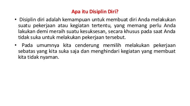 Erti disiplin diri. 2015Definisi disiplin diri adalah sebuah jembatan bagi Anda untuk mencapai suatu kemungkinan hasil tertinggi dan terbaik yang merupakan hal penting dalam mengisi hidup. Disiplin Diri Pribadi Disiplin pribadi itu mengangut beberapa unsur seperti adanya sesuatu yang harus ditaati atau juga ditinggalkan dan adanya proses sikap seseorang terhadap hal tersebut. Pada masa yang sama disiplin diri merupakan elemen penting dalam diri murid-murid supaya nilai-nilai murni yang lain dapat dipupuk.