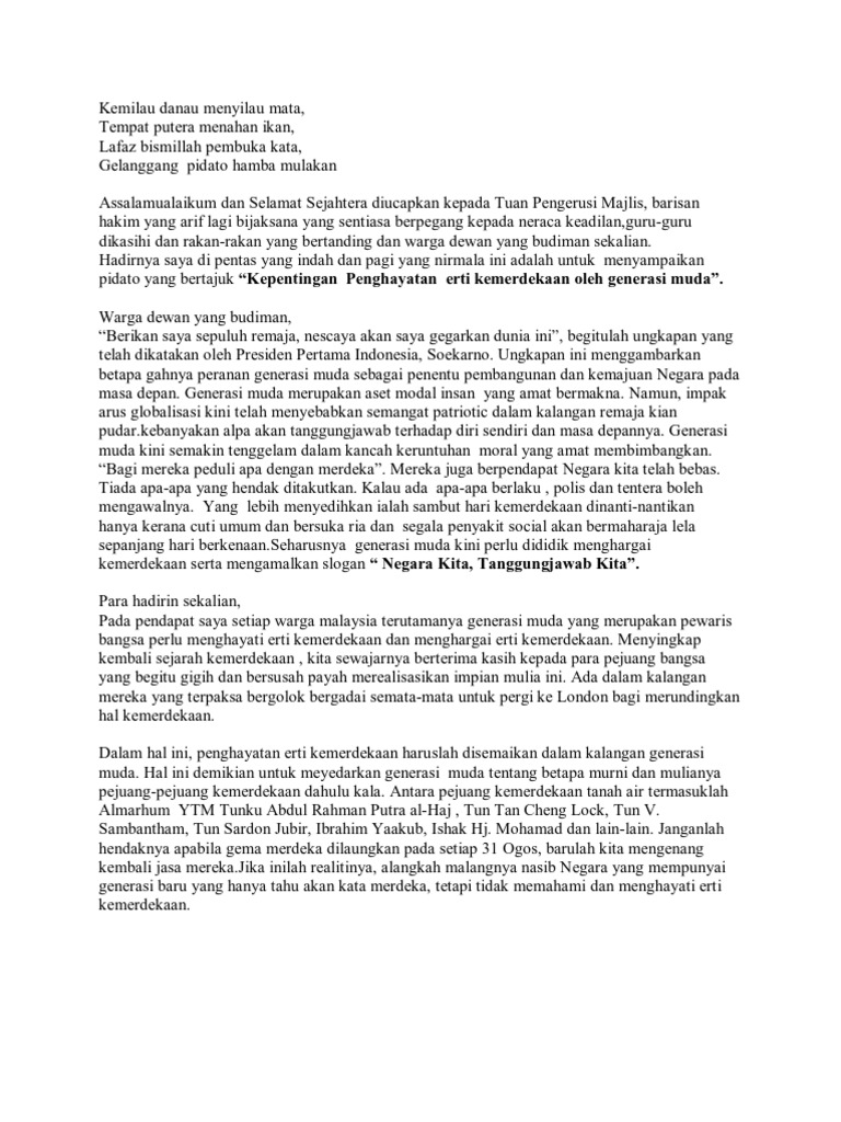 Semoga kita menghayati apa erti kemerdekaan kepada kita terutama generasi yang lahir selepas merdeka kerana peristiwa ini sesuatu yang sangat. Contoh Karangan. Wacana perdana saya memahami erti kemerdekaan menjamin kemerdekaan negaratanggal 31 ogos 1957 merupakan satu tarikh yang tidak asing bagi kita selaku warga merdeka.
