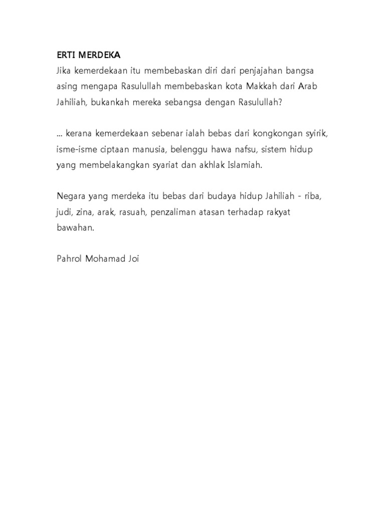 Erti merdeka yang sebenar. Erti MERDEKA yang sebenarnya Erti Merdeka pada setiap individu adalah berbeza-beza. Ini bermakna intipati kemerdekaan yang sebenar adalah kebebasan manusia daripada dorongan hawa nafsu dan syaitan kebebasan daripada cintakan dunia yang melampau sehingga mengetepikan nilai-nilai akhlak dan etika. Merdeka itu hanyalah suatu kalimah yang erti sebenarnya seringkali disalahertikan.