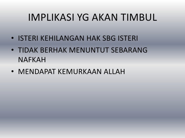Pegawai Agama ertinya Pegawai Agama Islam Daerah atau Pegawai Hal Ehwal Agama Islam. Implikasi Yang Akan Timbul Daripada Nusyuz -Isteri akan kehilangan hak sebagai seorang isteri seperti tidak mendapat perelanjaan harian dan pakaian. NUSYUZ PEMUSNAH KEBAHAGIAAN 51 Pengertian Nusyuz 1.