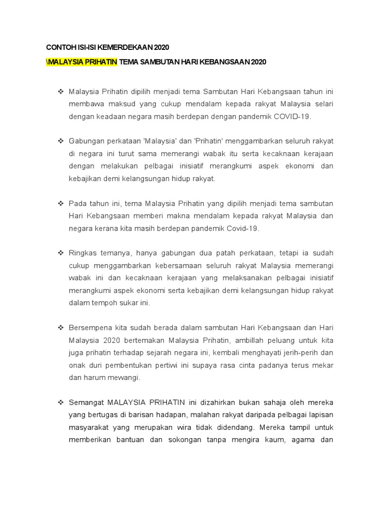 Sebelum ini sambutan Hari Kebangsaan Malaysia 2020 logo berbentuk hati dengan warna Jalur Gemilang telah direka bersama tema yang dipilih iaitu Malaysia Prihatin. ERTI SEBUAH KEMERDEKAAN DALAM REALITI DAN CABARAN MASAKINI. By Dr Jeniri Amir.