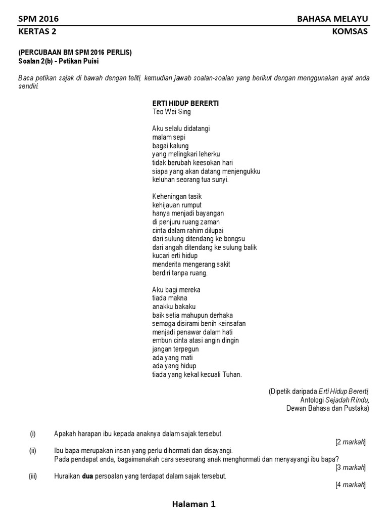 ERTI HIDUP BERERTI Aku selalu didatangi Malam sepi Bagai kalung Yang melingkari leherku Tidak berubah keesokan hari Siapa yang akan menjengukku Keluhan seorang tua sunyi Keheningan tasik. SOALAN SPM 2016 BAHASA MELAYU KERTAS 1 BAHASA ME. Sajak Erti Hidup Bererti.